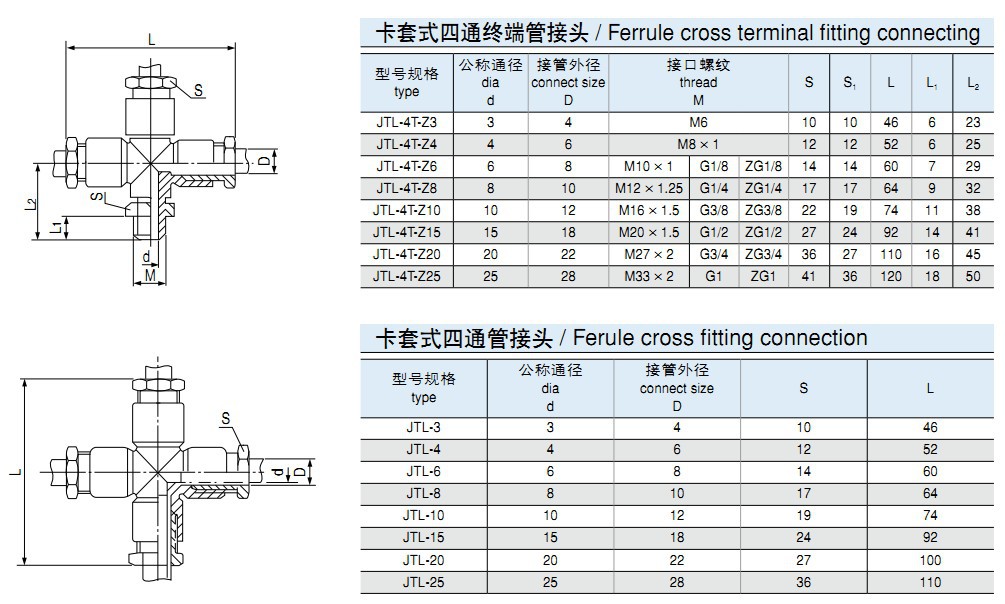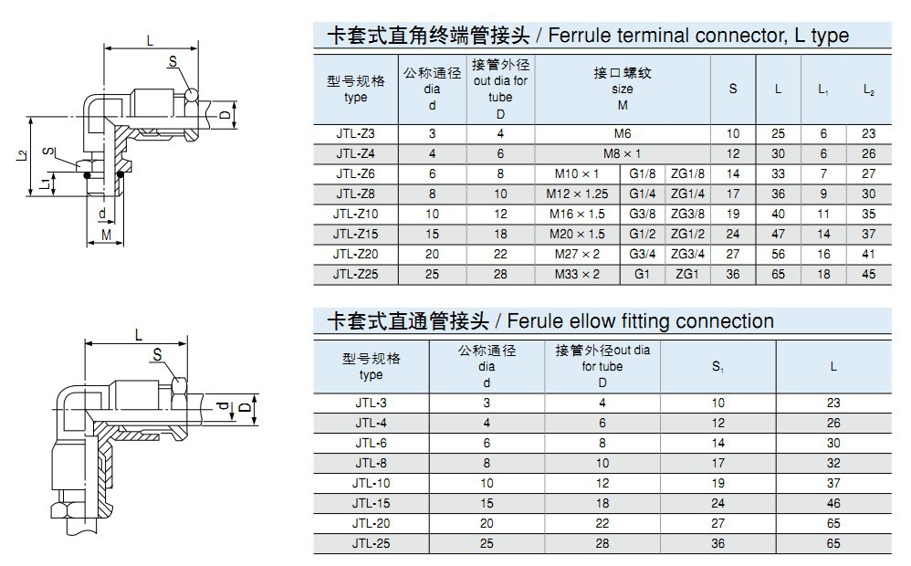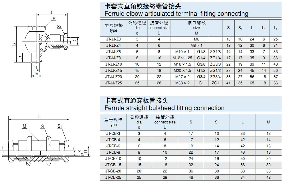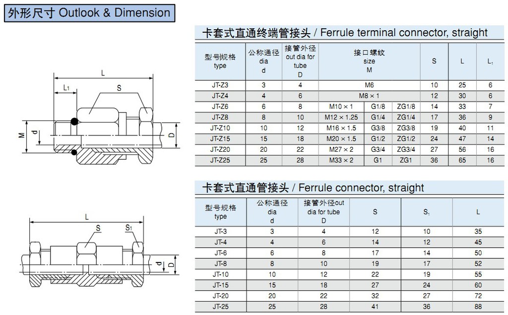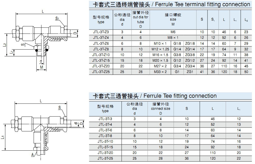 *標(biāo)記示例:①:卡套式三通終端管接頭 公稱通徑 Ø6MM JT-3T-Z6 M10×1