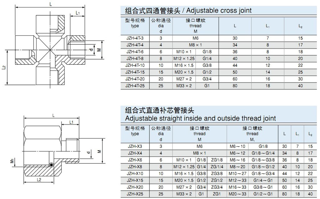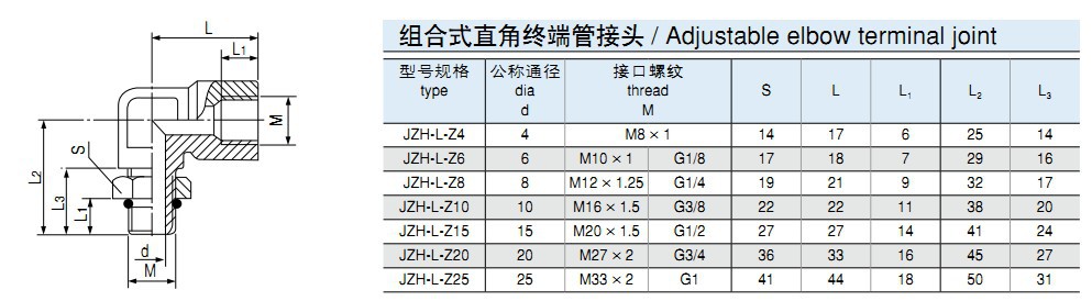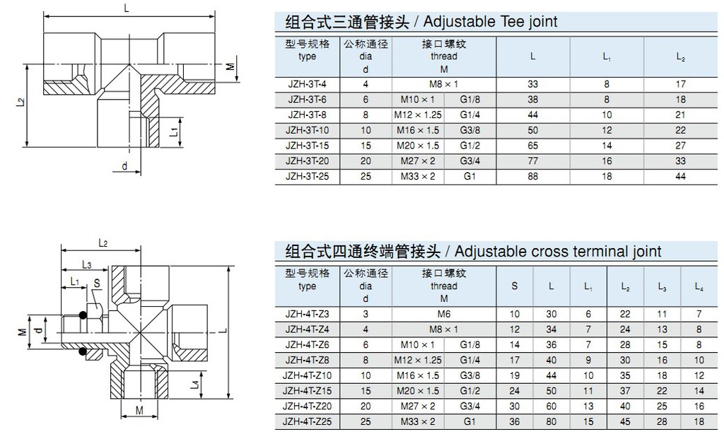 • 標(biāo)記示例: ①:組合式三通終端管接頭 公稱通徑 Ø6MM JZH-3T-Z6 M10×1