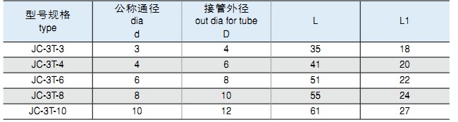 安裝及應(yīng)用一、JC系列插入式管接頭,適用于連接硬質(zhì)、半硬質(zhì)尼龍管、塑料管,最大工作壓力為1.0MPa。該系列管接頭安裝方便,密封可靠,接管牢固、美觀。二、1、氣管切斷后去除毛刺, 將氣管一端插入接頭插口內(nèi)(一定要插到底)即可達(dá)到牢