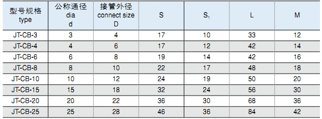 一、JT系列卡套式管接頭適用于有色金屬管,編織尼龍管的連接。最大工作壓力為1.0MPa。