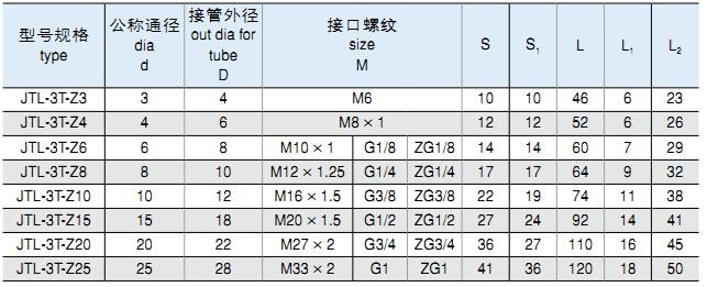 *標(biāo)記示例:①:卡套式三通終端管接頭 公稱通徑Ø6MM JT-3T-Z6 M10×1