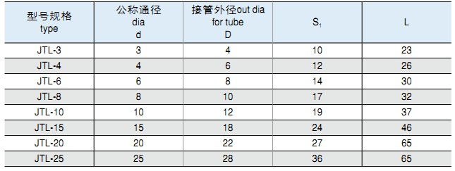一、JT系列卡套式管接頭適用于有色金屬管,編織尼龍管的連接。最大工作壓力為1.0MPa。