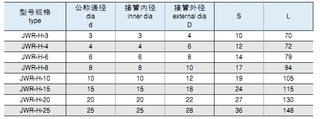 一、JWR系列外插式管接頭,適用于連接軟質(zhì)尼龍管,塑料管及膠管。最大工作壓力為1.0MPa。該系列接頭具有結(jié)構(gòu)簡單,使用方便,安裝牢固等優(yōu)點。