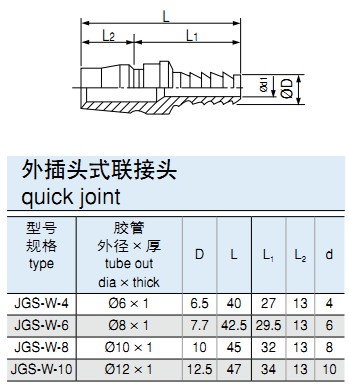 型號(hào)規(guī)格說(shuō)明,下圖例JGS-W-6A(JGS-K-6B)插入式外螺紋接口。高性能快速接頭,外插式內(nèi)螺紋接口。