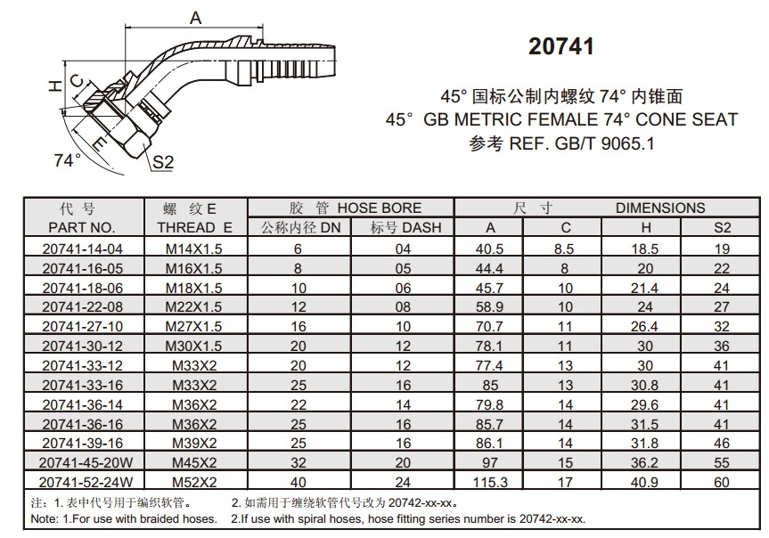 20741 45°國標(biāo)公制內(nèi)螺紋74°內(nèi)錐面 扣壓式軟管接頭