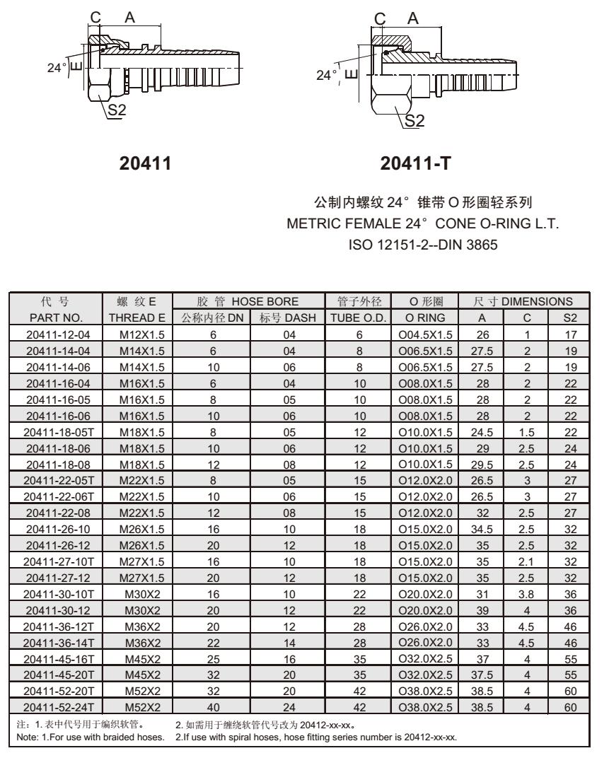 20411 公制內(nèi)螺紋24°錐帶O形圈輕系列 扣壓式軟管接頭