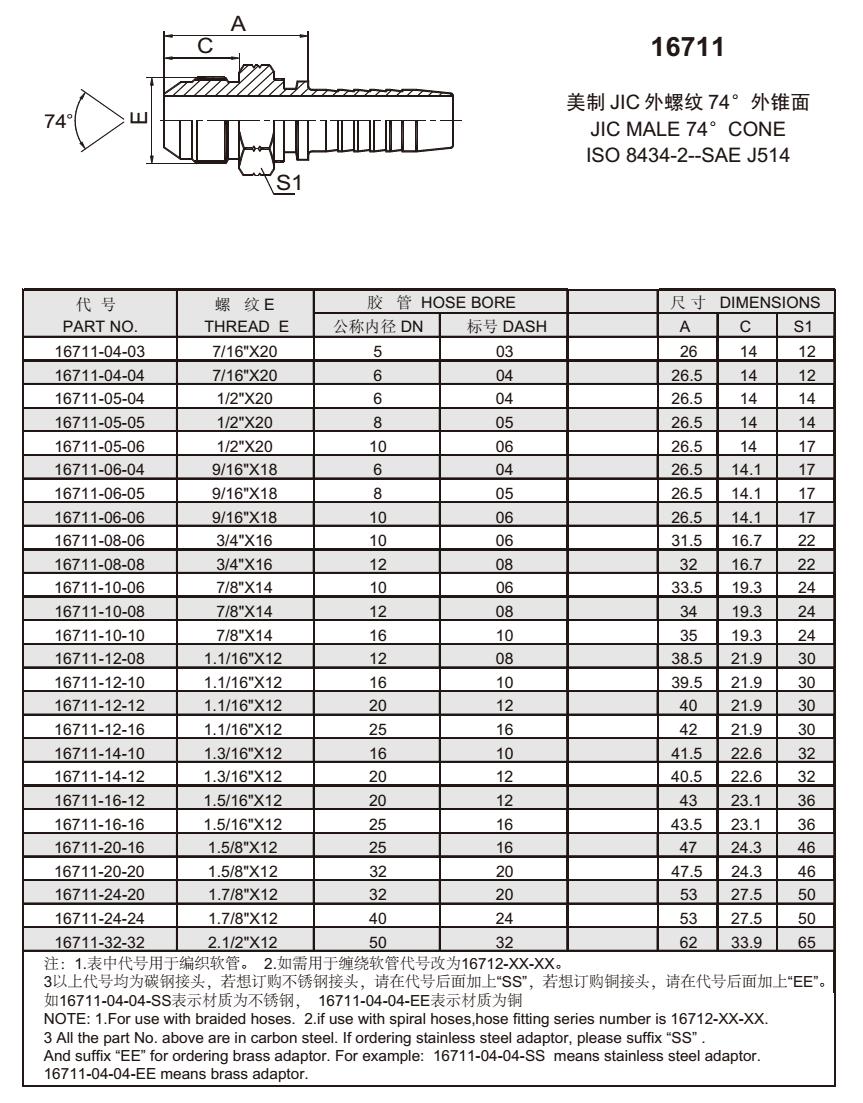 16711 美制JIC外螺紋74°外錐面