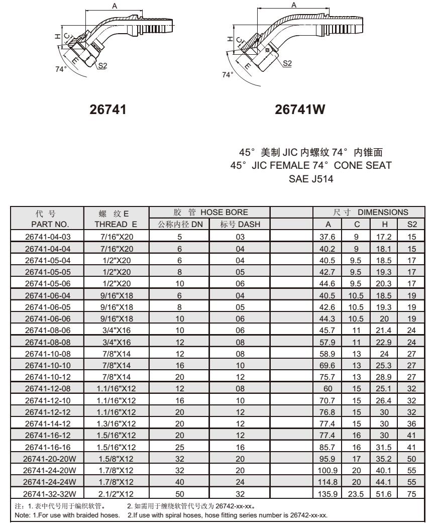 26741 45°美制JIC內螺紋74°內錐面