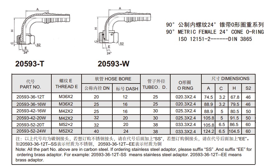 20593-T 20593-W 90°公制內(nèi)螺紋24°錐帶O形圈重系列