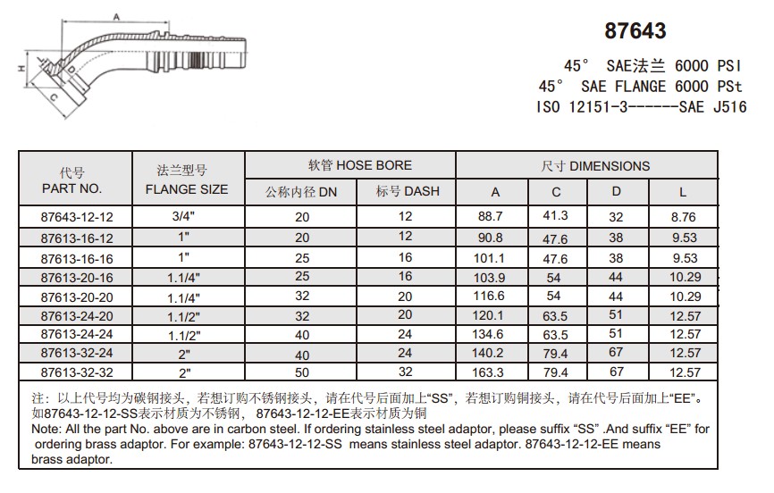 87643 45° SAE法蘭 6000 PSI