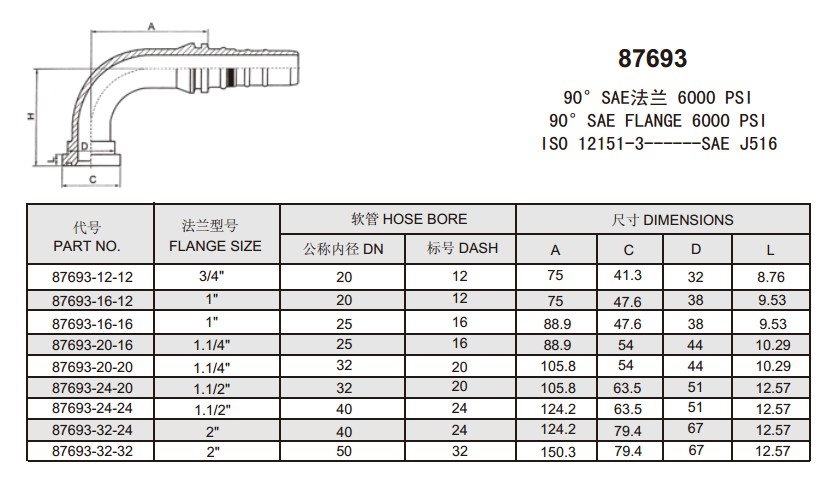 87693 90°SAE法蘭 6000 PSI