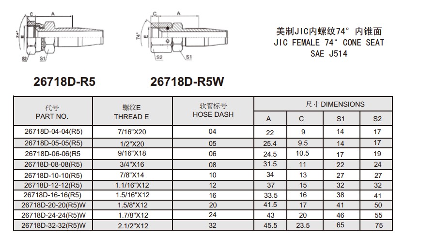 26718D-R5 26718D-R5W 美制JIC內(nèi)螺紋74°內(nèi)錐面