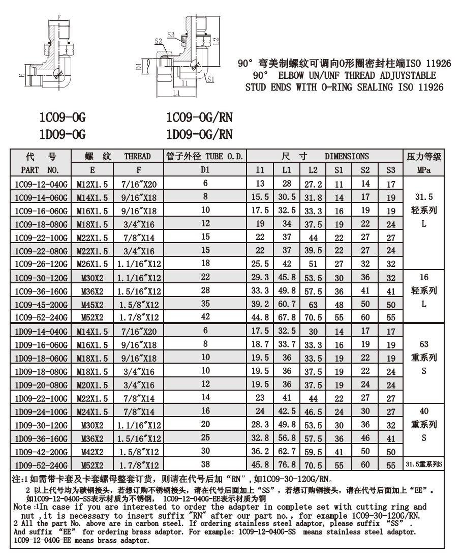 1CO9-OG 1DO9-OG 90°彎美制螺紋可調(diào)向O形圈密封柱端ISO 11926