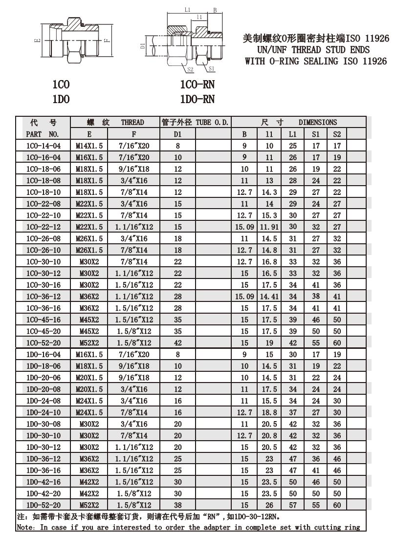 1C0 1D0 美制螺紋O形圈密封柱端ISO 11926