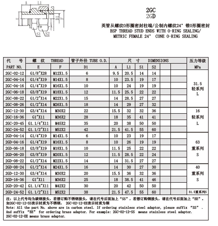 2GC 1GD 英管從螺紋O形圈密封柱端/公制內(nèi)螺紋24°錐O形圈密封