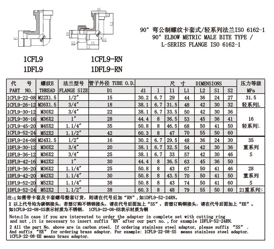 1CFL9 1DFL9 90°彎公制螺紋卡套式/輕系列法蘭ISO 6162-1
