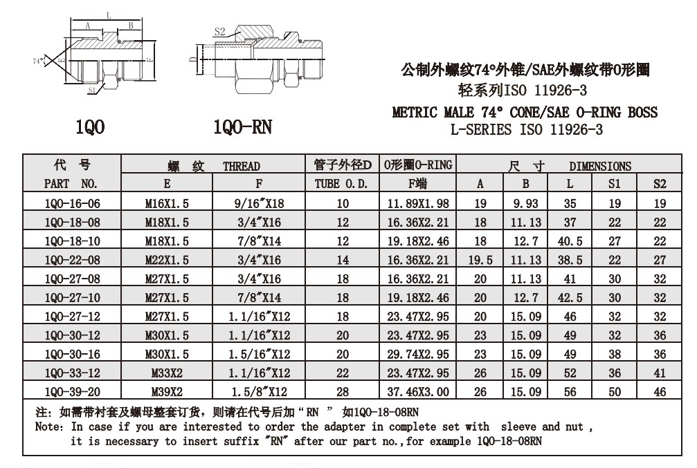 1Q0 1Q0-RN 公制外螺紋74°外錐/SAE外螺紋O型圈
