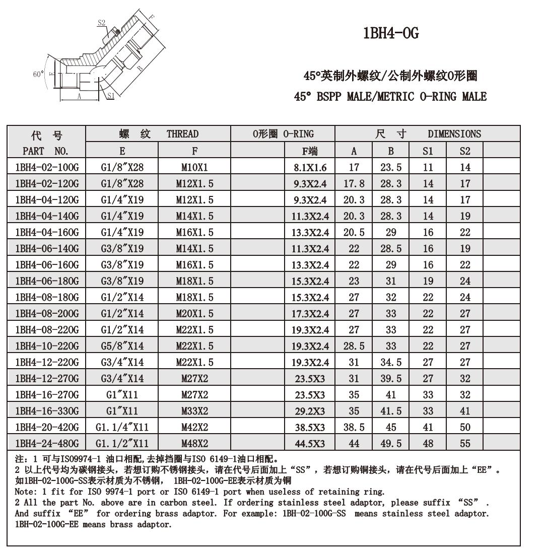1BH4-OG 45°英制外螺紋/公制外螺紋O型圈