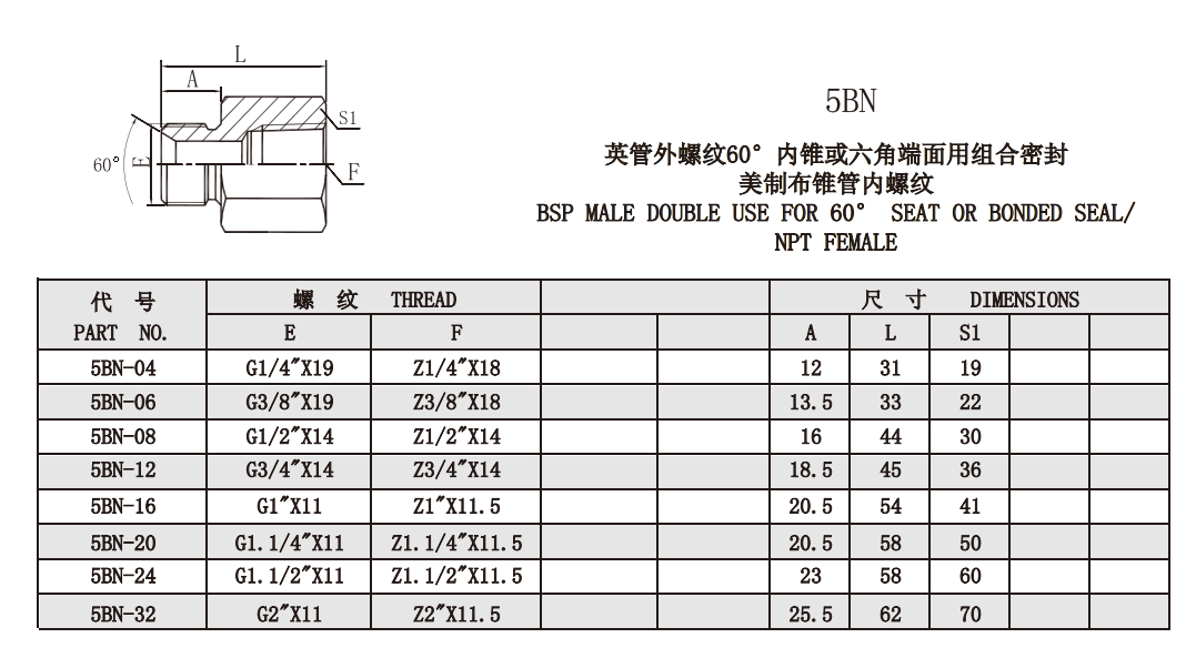 5BN 英管外螺紋60°內錐或六角端面用組合密封 美制布錐管內螺紋