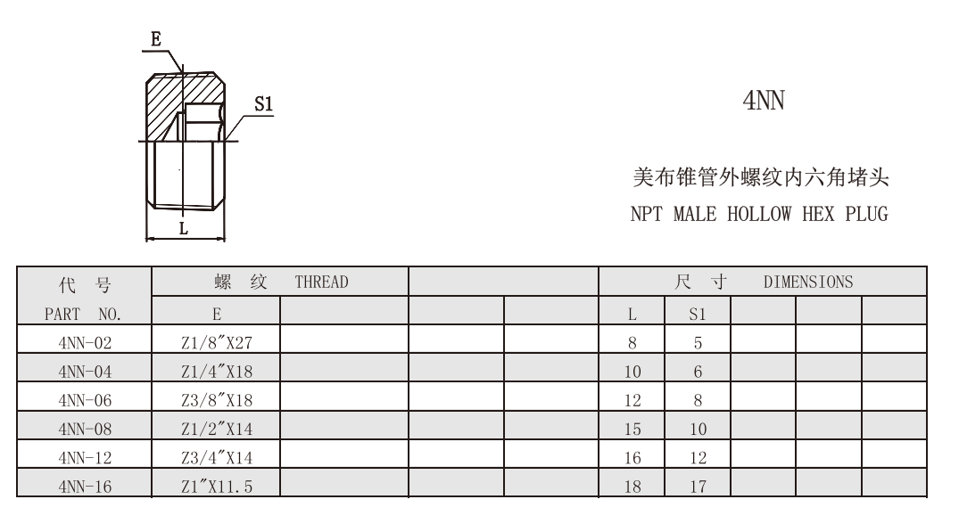 4NN 美制布錐管外螺紋內(nèi)六角堵頭