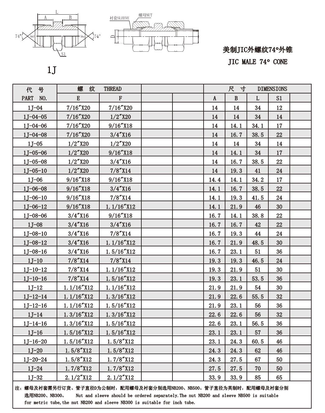 1J 美制JIC外螺紋74°外錐