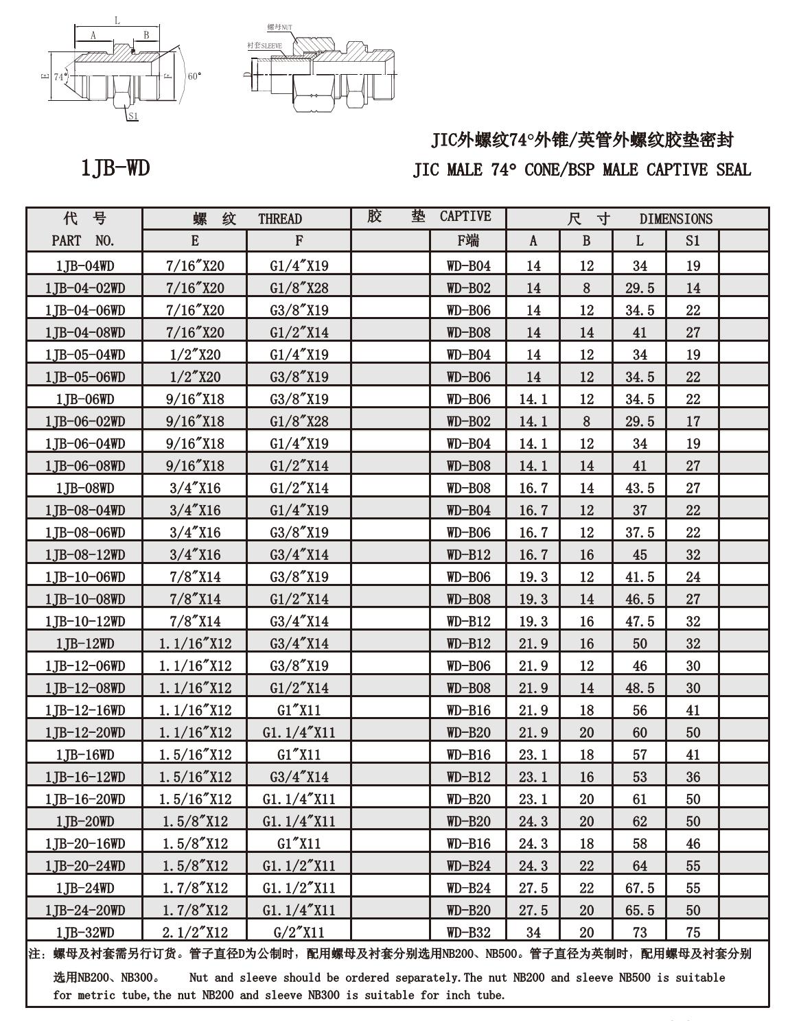 1JB-WD JIC外螺紋74°外錐/英管外螺紋膠墊密封
