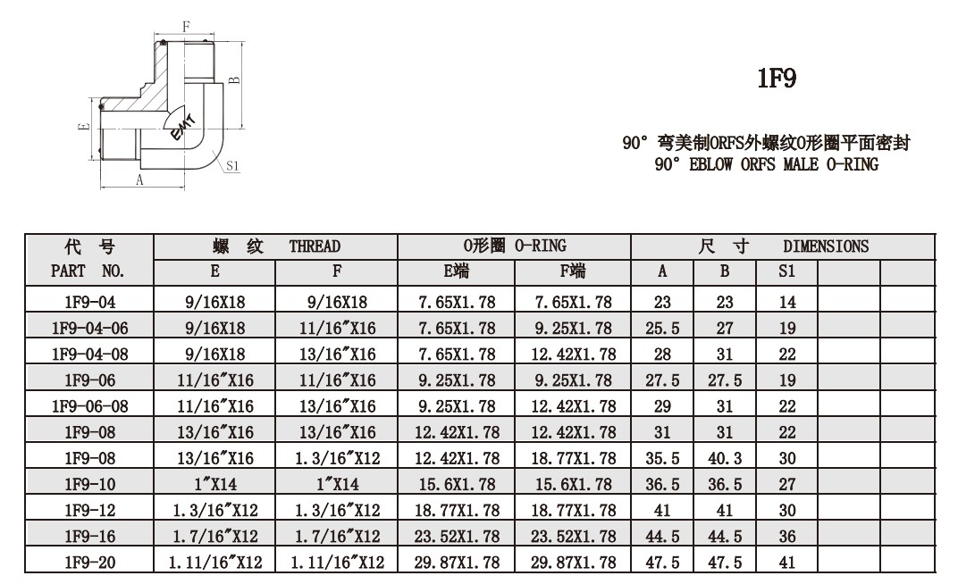 1F9 90°彎美制ORFS外螺紋O形圈平面密封