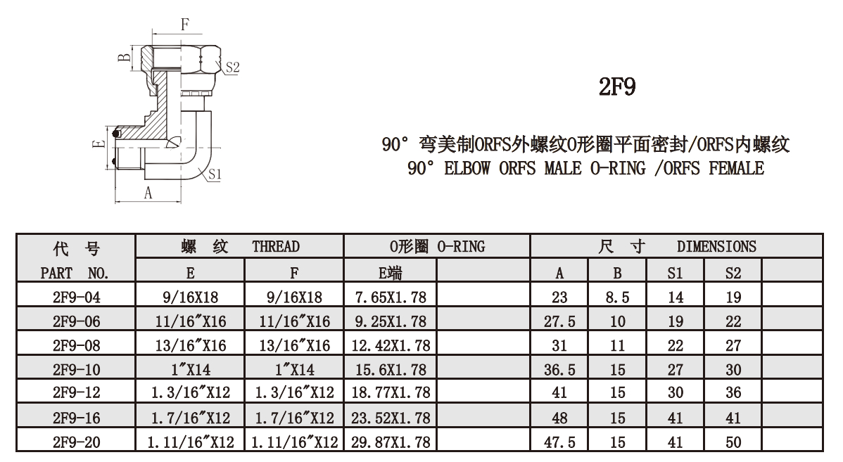 2F9 90°彎美制ORFS外螺紋O形圈平面密封/ORFS內(nèi)螺紋