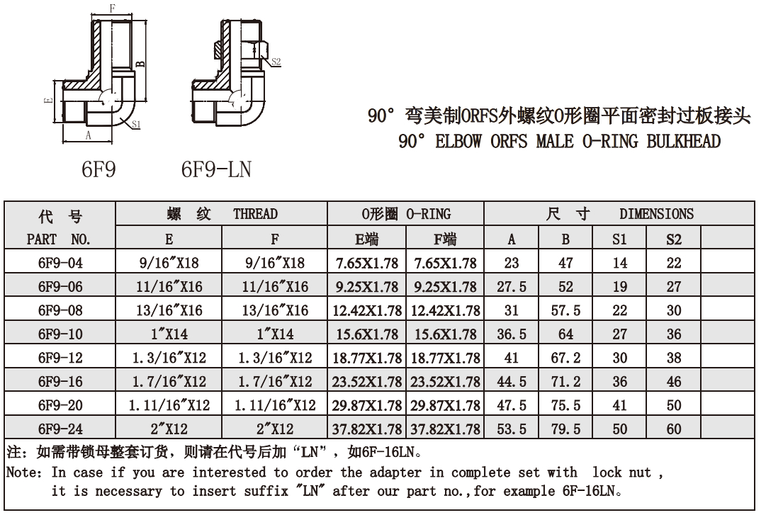 6F9 90°彎美制ORFS外螺紋O形圈平面密封過板接頭