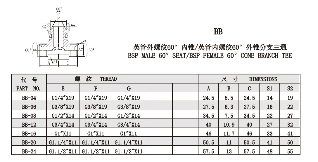 BB 英管外螺紋60°內錐/英管內螺紋60°外錐分支三通