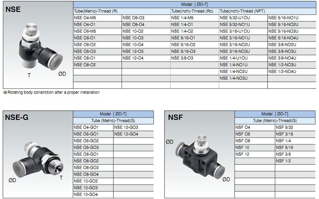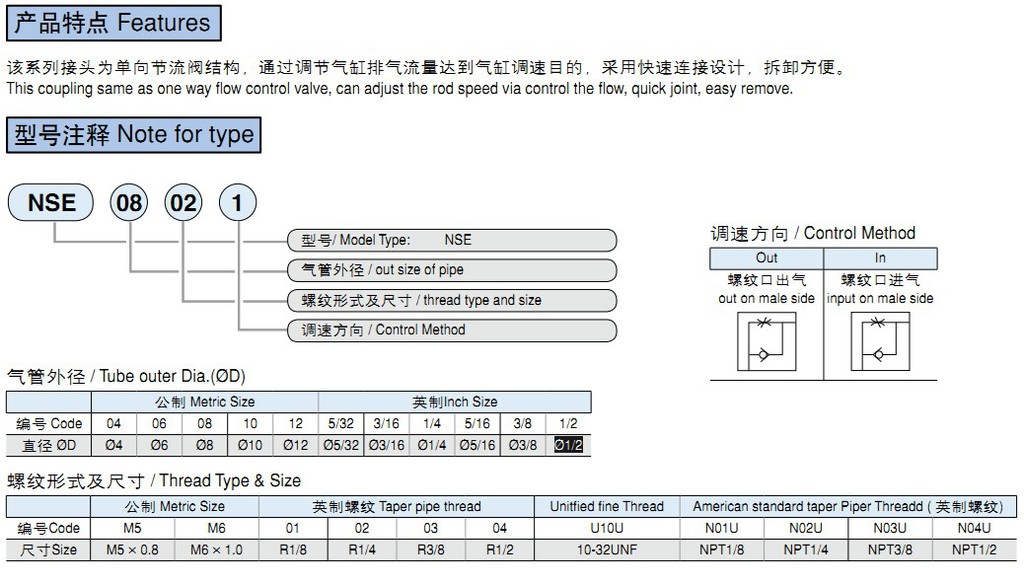 氣動接頭 快插式 NSE系列,為單向節(jié)流閥結(jié)構(gòu),通過調(diào)節(jié)氣缸排氣流量達(dá)到氣缸調(diào)速目的,采用快速連接設(shè)計,拆卸方便。