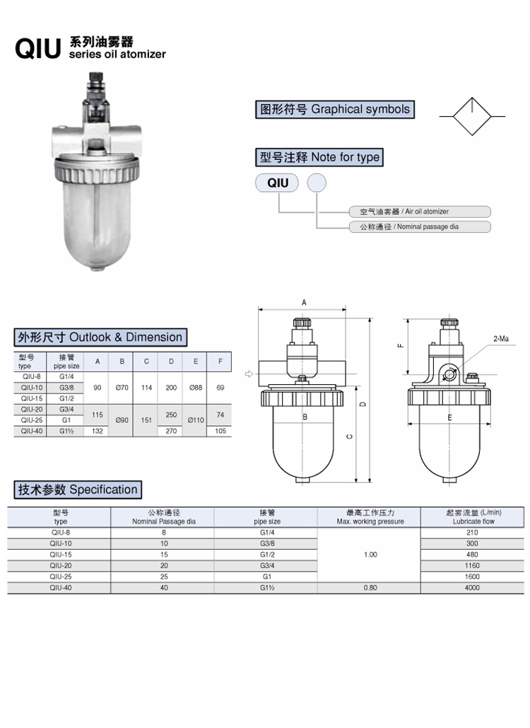 油霧器QIU系列 技術(shù)參數(shù) 型號公稱通徑(mm)接管最高工作壓力(MPa)過濾度*(L/min)QIU-88G1/41.00210 QIU-1010G3/8300QIU-1515G1/2480QIU-2020G3/41160QIU-2525G11600QIU-4040G11/20.804000 #工作壓力0.63MPa,滴油量 5 滴/min,潤滑油運動粘