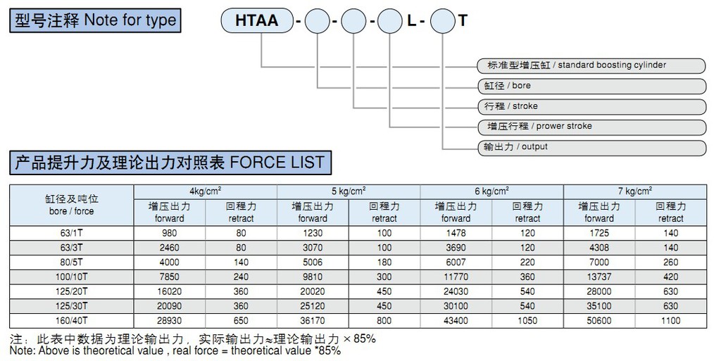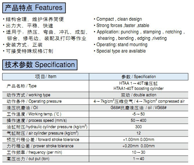 技術參數 Specification項目/ Item 參數 / Specification產品名稱 / TypeHTAA 1~40T增壓缸HTAA1-40T boosting cylinder動作方式 /&nb