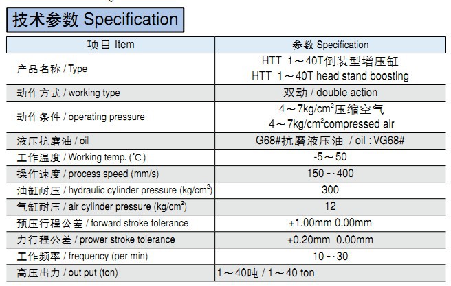技術(shù)參數(shù) Specification項目 Item 參數(shù) Specification產(chǎn)品名稱 / TypeHTT 1~40T倒裝型增壓缸HTT 1~40T head stand