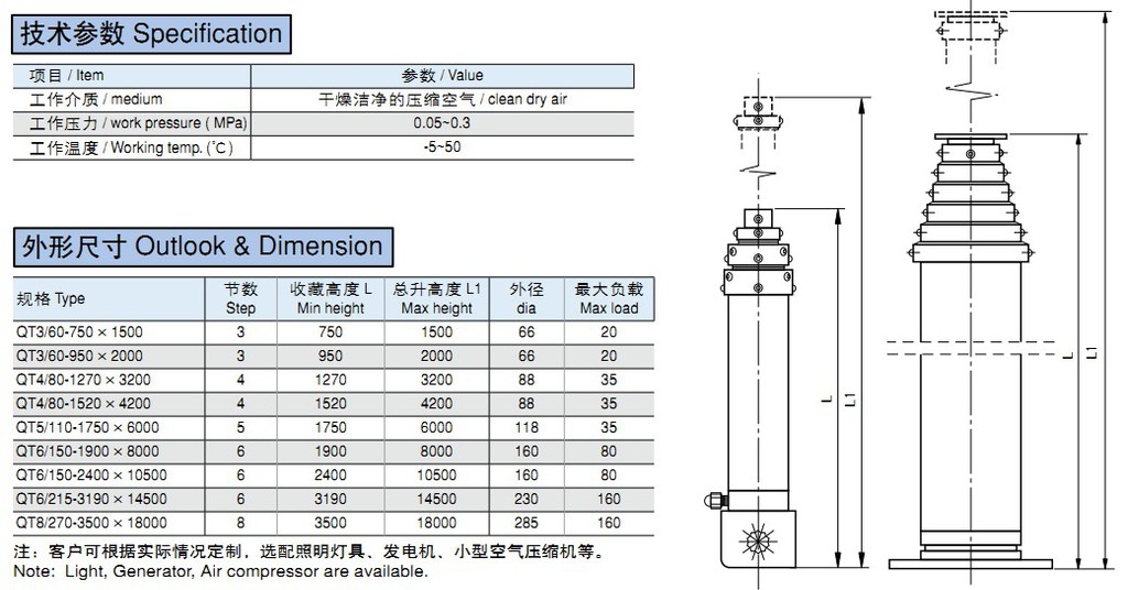 單作用多級(jí)升縮氣缸QT系列可按要求非標(biāo)定制