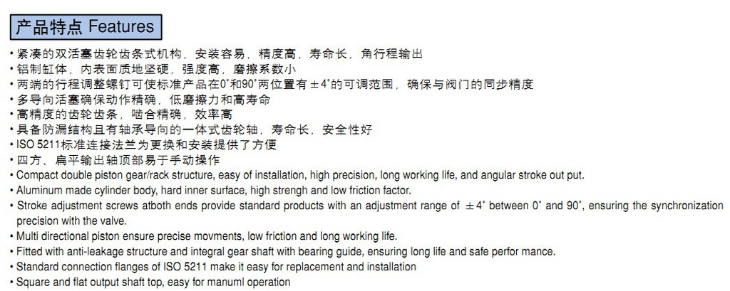 • 緊湊的雙活塞齒輪齒條式機構(gòu),安裝容易,精度高,壽命長,角行程輸出