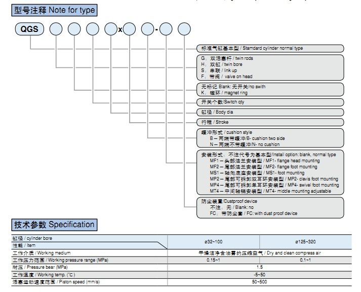 QGS系列氣缸在結(jié)構(gòu)要素尺寸、安裝形式和尺寸方面都