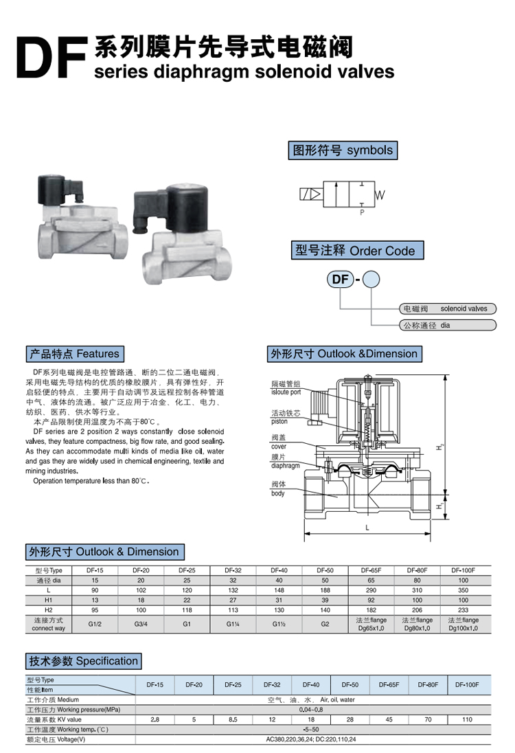 DF系列 膜片先導(dǎo)式電磁閥 產(chǎn)品特點(diǎn) DF系列電磁閥是電控管路通、斷的二位二通電磁閥,采用電磁先導(dǎo)結(jié)構(gòu)的優(yōu)質(zhì)的橡膠膜片,具有彈性好,開啟輕便的特點(diǎn),主要用于自動調(diào)節(jié)及遠(yuǎn)程控制各種管道中氣、液體的流通。被廣泛應(yīng)用于冶