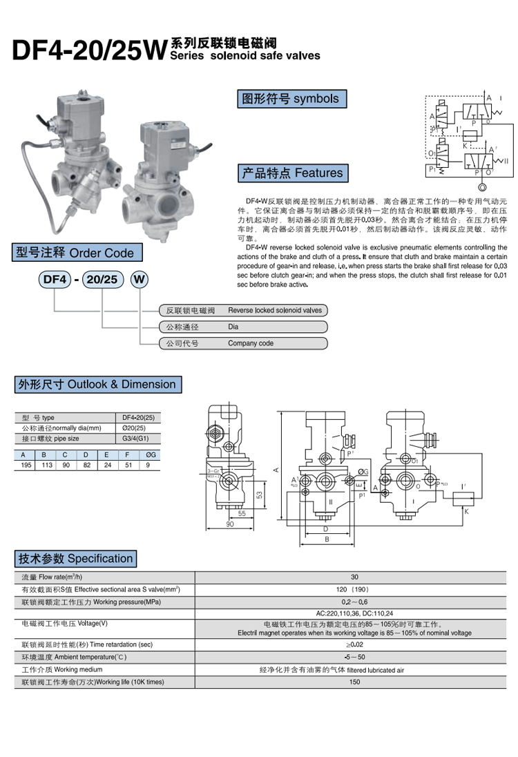 DF4-W系列 反聯(lián)鎖電磁閥 產(chǎn)品特點 DF4-W反聯(lián)鎖閥是控制壓力機制動器、離合器正常工作的一種專用氣動元件。它保證離合器與制動器必須保持一定的結(jié)合和脫霸載順序號,即在壓力機起動時,制動器必須首先脫開0.03秒。然合離合才能結(jié)合;在壓力機停車時,離合