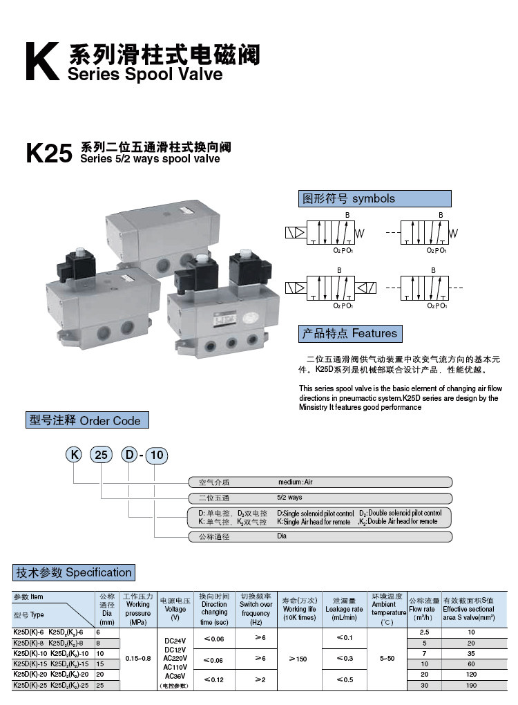 K25系列 二位五通換向閥產(chǎn)品特點(diǎn) 二位五通滑閥供氣動裝置中改變氣流方向的基本元件。K25D系列是機(jī)械部聯(lián)合設(shè)計(jì)產(chǎn)品,性能優(yōu)越。圖形符號:型號注釋:技術(shù)參數(shù):型號參數(shù)公稱通徑mm工作壓力MPa電源電壓V換向時間(sec)切換頻率(Hz)壽命萬次