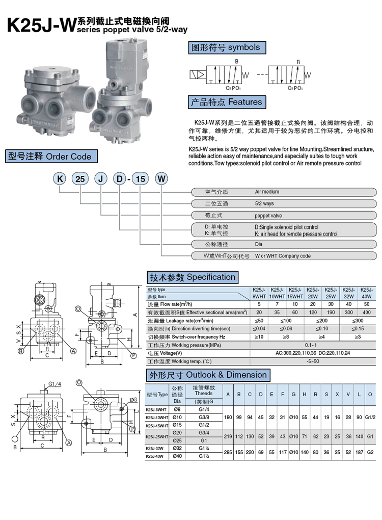 K25J-W系列 二位五通管接截止式換向電磁閥 產(chǎn)品特點(diǎn) K25J-W系列是二位五通管接截止式換向閥。該閥結(jié)構(gòu)合理,動作可靠,維修方便,尤其適用于較為惡劣的工作環(huán)境。分電控和氣控兩種。