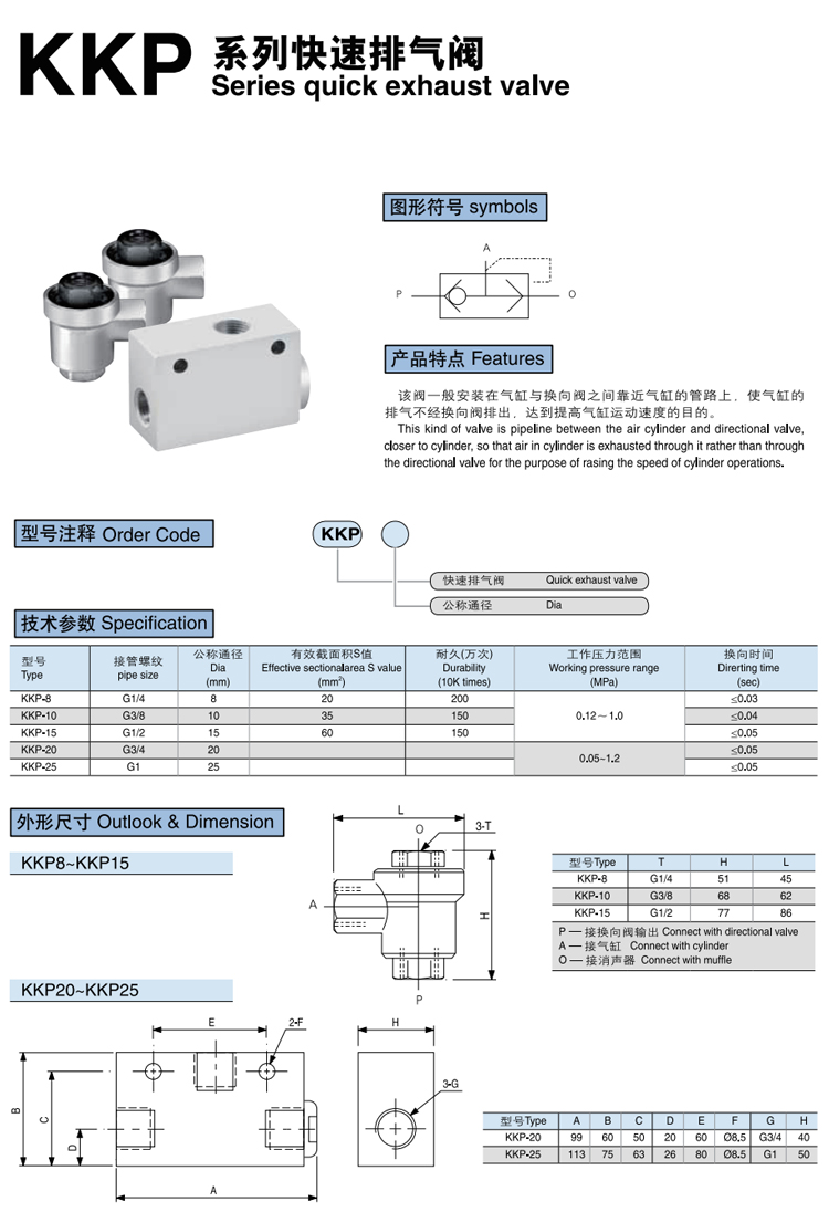 KKP系列 快速排氣閥 產(chǎn)品特點(diǎn):該快速排氣閥,快排閥一般安裝在氣缸與換向閥之間靠近氣缸的管路上,使氣缸的排氣不經(jīng)換向閥排出,達(dá)到提高氣缸運(yùn)動(dòng)速度的目的。