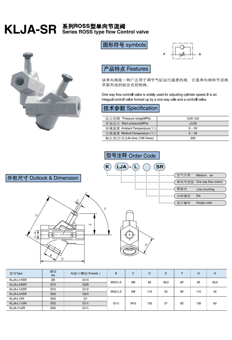 KLJA-SR系列 ROSS型單向節(jié)流閥 產(chǎn)品特點 單向節(jié)流閥是一種廣泛用于調(diào)節(jié)氣缸運行速度的閥,它是單向閥和節(jié)流閥并聯(lián)而成的給事式控制閥。