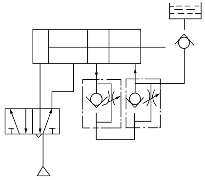 圖2 所示為利用液壓阻尼缸實(shí)現(xiàn)速度控制的回路。阻尼缸與氣缸的連接可以是串聯(lián),也可以是并聯(lián)。圖示為串聯(lián)形式。回路中,通過(guò)調(diào)節(jié)單向節(jié)流閥的開(kāi)度,實(shí)現(xiàn)氣缸的無(wú)級(jí)調(diào)速。